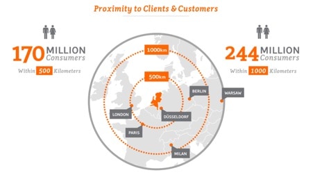 La puerta de entrada neerlandesa está apoyada por puertos marítimos reconocidos mundialmente, aeropuertos con los últimos desarrollos tecnológicos y una extensa y moderna red de trenes carreteras y autopistas. La infraestructura logística neerlandesa llega a 170 millones de consumidores en menos de 24 horas desde Amsterdam o Róterdam al resto de Europa, lo que convierte a Países Bajos en el trampolín perfecto hacia el mercado europeo.