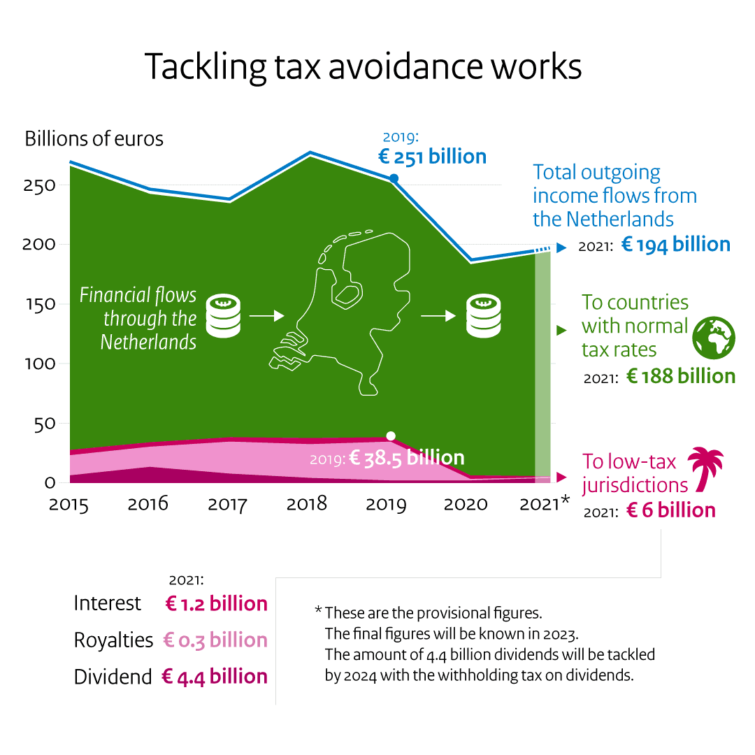 En los últimos años, Países Bajos ha tomado diversas medidas para combatir la evasión fiscal, que ya están dando sus frutos. El flujo de dinero desde Países Bajos hacia países con baja o nula tributación se ha reducido considerablemente. Según las cifras provisionales, el flujo total de ingresos hacia esos países se ha reducido en casi un 85%, pasando de 38.500 millones de euros en 2019 a tan sólo 6.000 millones en 2021. Esto se debe a que los pagos de intereses y cánones a los países de baja imposición han pasado de 36.400 millones de euros en 2019 a una estimación provisional de 1.500 millones de euros en 2021.