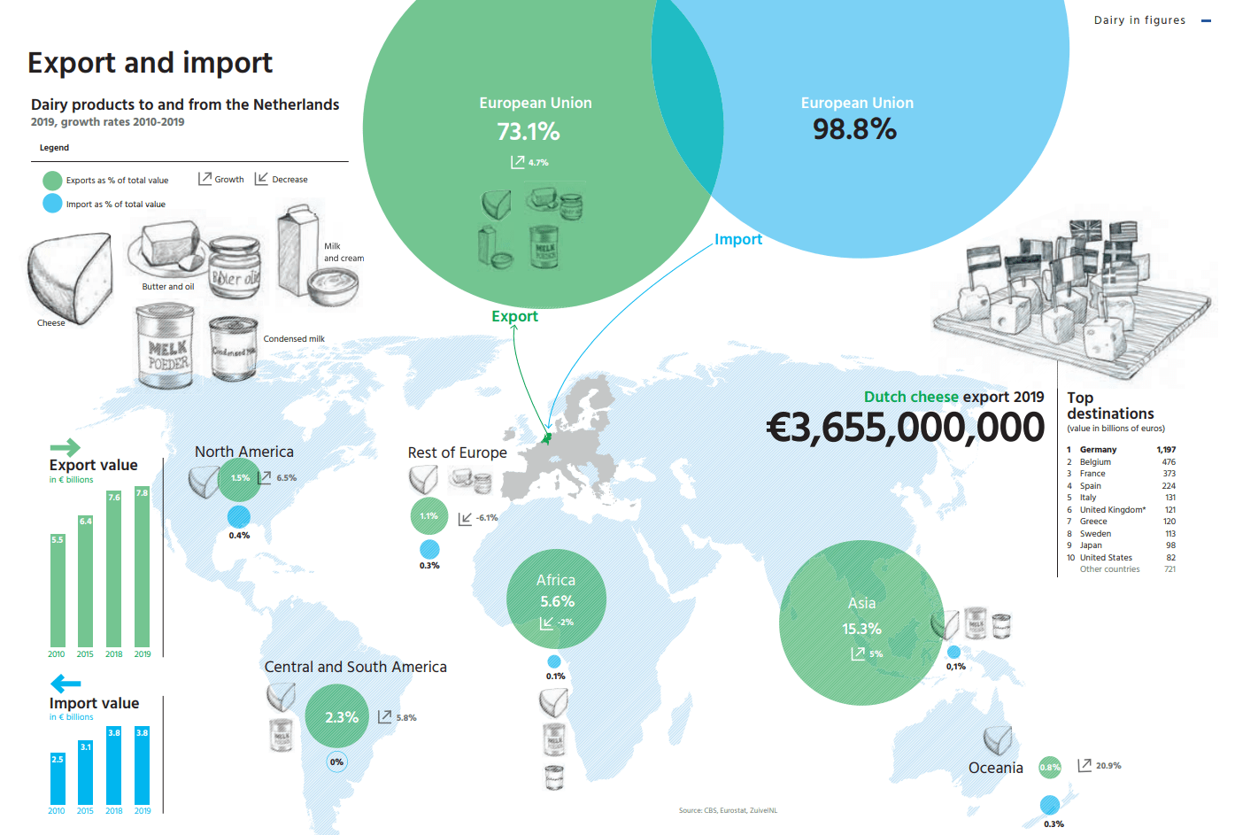 La calidad y la innovación es la seña de identidad de los productos lácteos neerlandeses. Incluso ahora, el sector lácteo sigue contribuyendo a la economía de Países Bajos de forma decidida.
