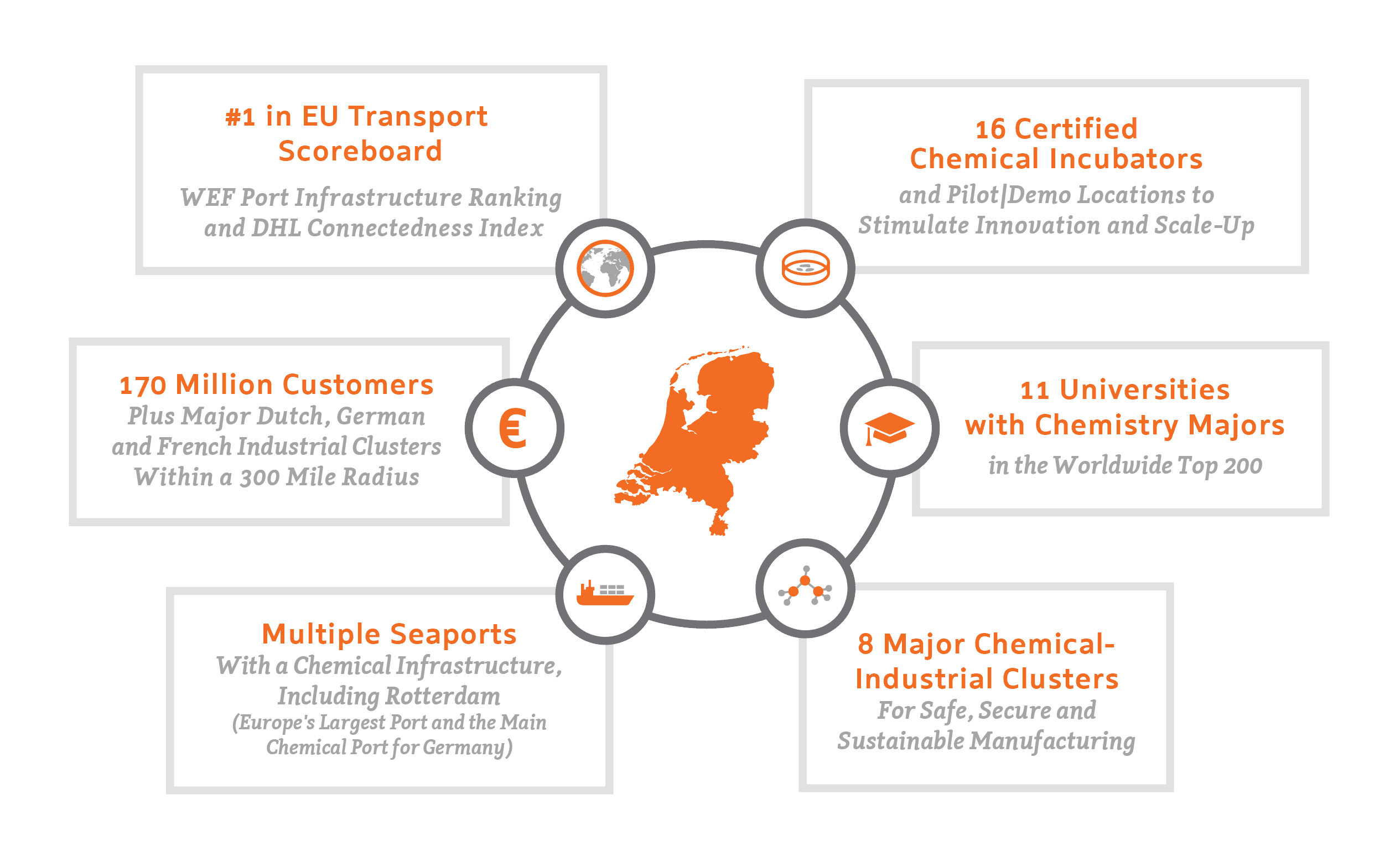Las empresas químicas en Países Bajos se benefician del excelente acceso que se ofrece desde cualquier lugar del país al mercado europeo. Desde Países Bajos, una empresa puede llegar a 170 millones de consumidores en el centro de Europa. El país se encuentran justo en el medio de la gran área de Amberes-Rotterdam-Rhein-Ruhr (ARRRA). Este es uno de los 5 principales clústeres químicos del mundo y alberga entre el 30 y el 40% de la facturación química en Europa.